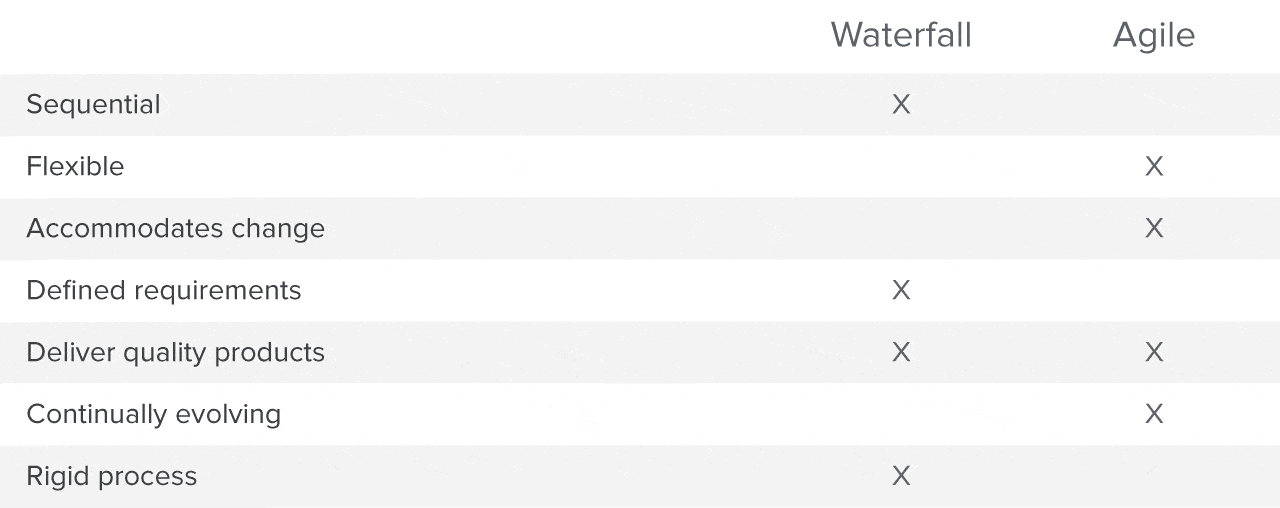 The differences between Waterfall methodology versus Agile can be summed up in two words: rigid vs flexible. Waterfall is a much stricter, rigid process whereas Agile is flexible and continuously evolving. Here’s more on their differences: